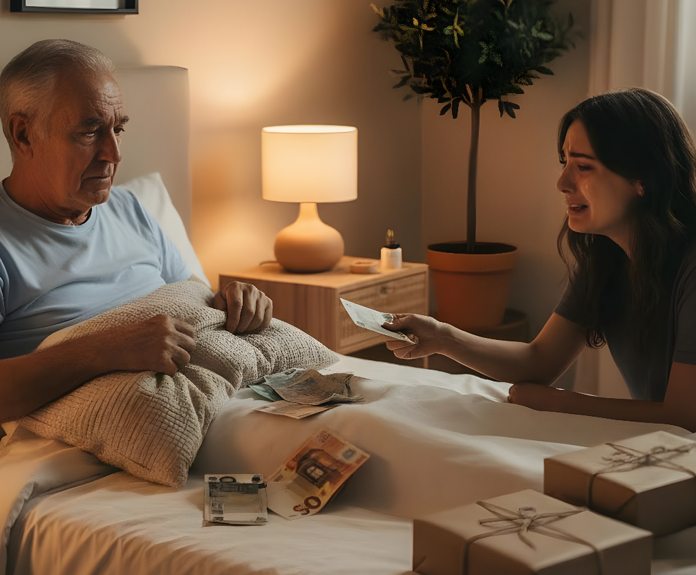 “Maria…” he whispered. His hand searched the bed, weak and shaking, until it found mine.