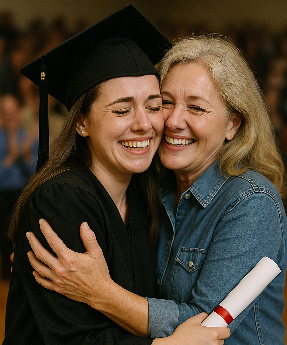 In the back row sat her mother — in her worn work clothes, hair streaked with gray, eyes shining with pride.