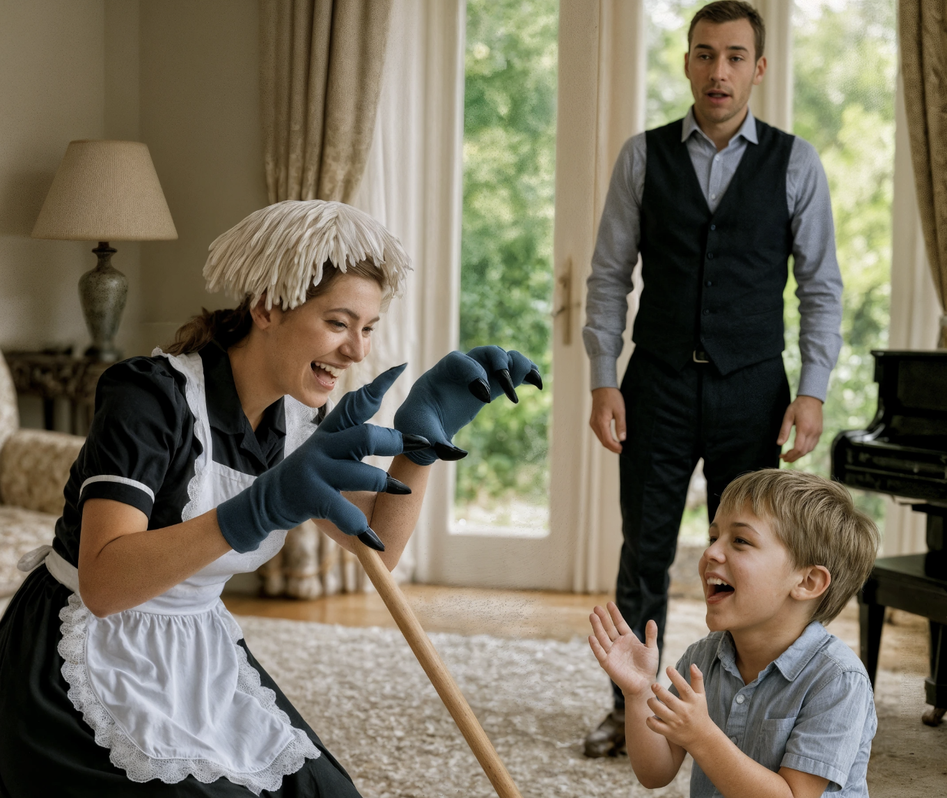 No staff greeted him; he had sent them away the previous afternoon. Yet what met his eyes froze him in place. In the center of the grand living room, Clara was pretending to be a roaring dinosaur, with a mop tied around her head as a mane. Lucas laughed uncontrollably, tears of joy sparkling in his eyes. Clara wasn’t merely playing; she was performing—growling, staggering, roaring again, then collapsing onto the floor like a defeated dragon. Lucas crawled over and wrapped his arms tightly around her neck.