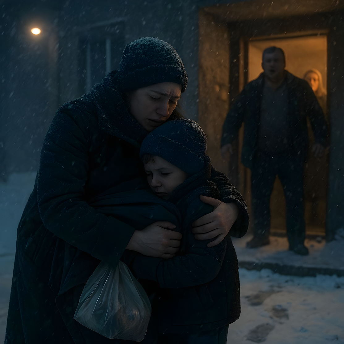 The night swallowed them whole. Snowflakes clung to Marija’s lashes as she stumbled through the courtyard, holding Kostya close. The wind howled like a living thing, wrapping around mother and son with cruel indifference. Her coat, thin and frayed, offered little warmth — yet her arms, trembling and strong, shielded the child as if love alone could fight the cold.
