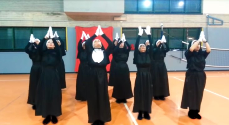 Twelve women, dressed head to toe in traditional nun habits and crisp white gloves, step onto the stage in perfect formation. Their movements are gentle and graceful, their posture serene. The crowd watches in respectful silence as soft music fills the air.