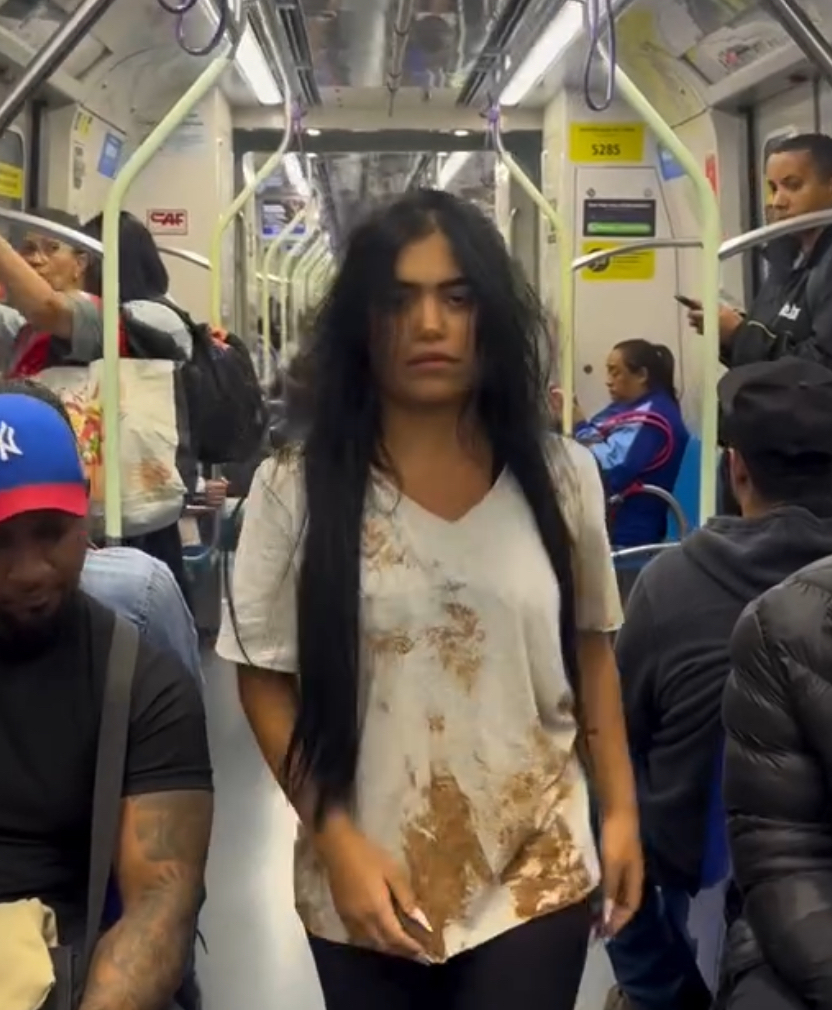 She sat quietly on the subway — barefoot, her clothes torn and dirty, her hair tangled.