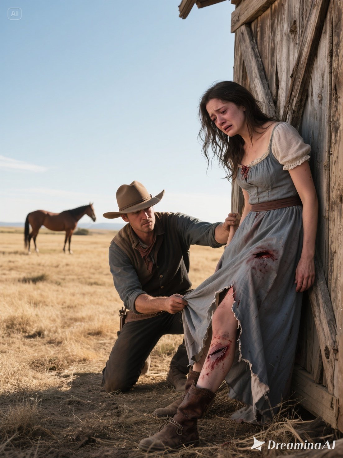 She stumbled towards him, her knees threatening to buckle, fingers gripping the barn wall for support. He observed the bruises marring her skin and the blood staining her shredded dress. And he caught her breathless plea: “Please… don’t lift the cloth.”